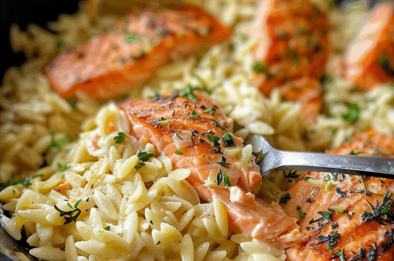 - Add the cooked orzo back into the skillet along with flaked salmon. Toss gently to coat everything in the sauce.