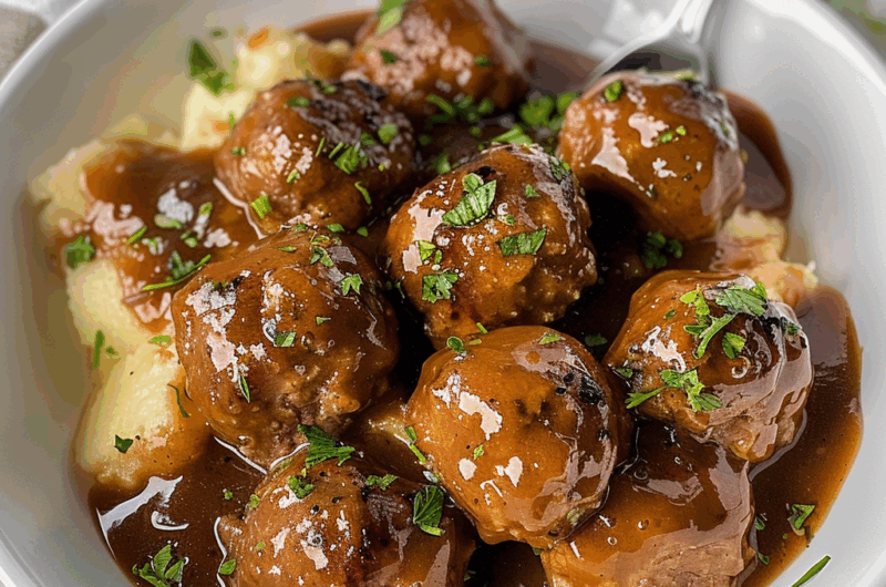 Once cooked through, serve these heavenly meatballs over mashed potatoes or rice for maximum enjoyment—don’t forget to drizzle extra gravy on top!