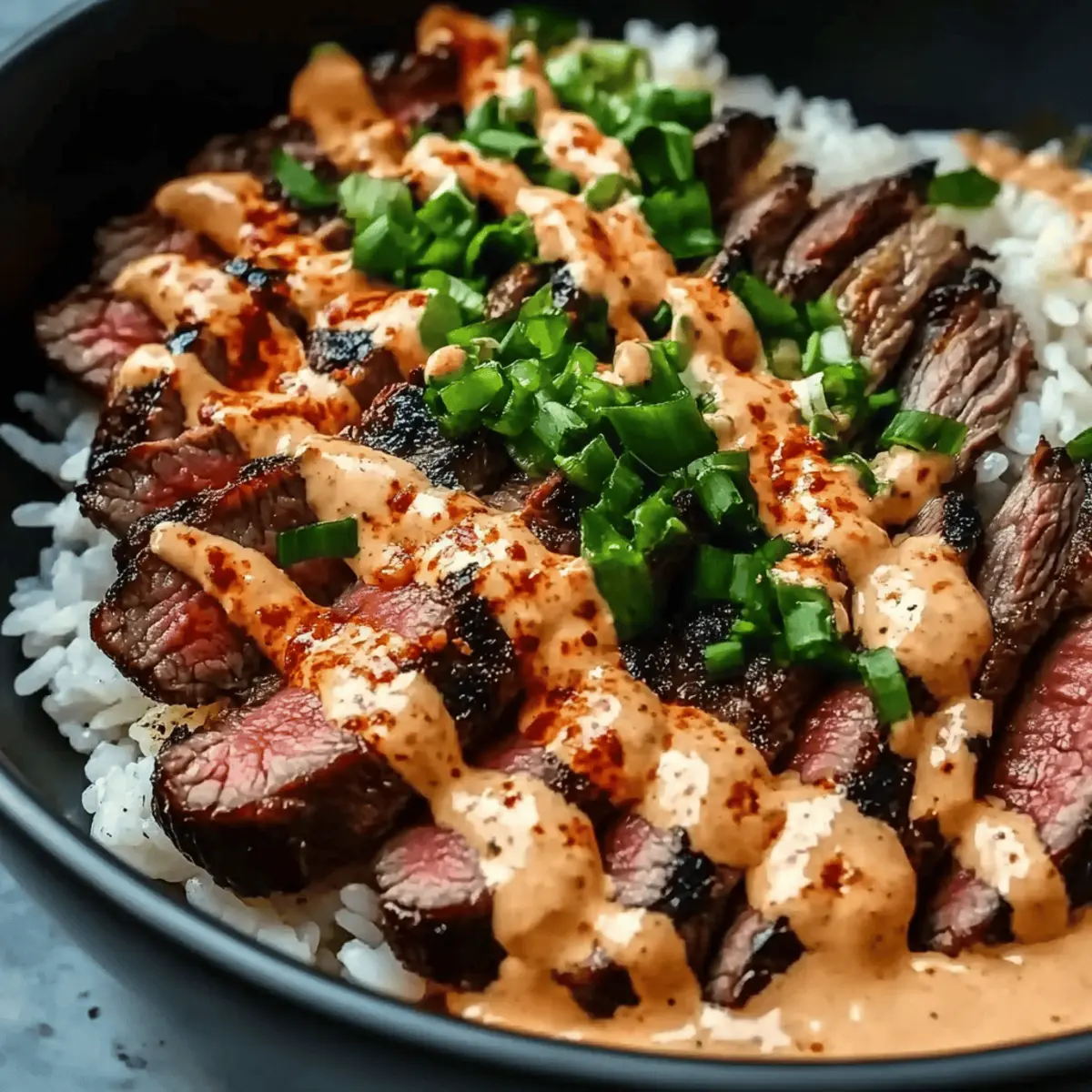 - Scoop warm rice into each serving bowl. Top with shredded lettuce, carrots, cucumber slices, and a generous portion of the cooked steak. Drizzle with spicy cream sauce, sprinkle with green onions and sesame seeds, and serve immediately.